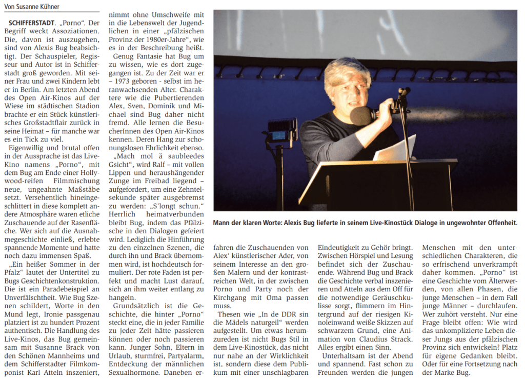 „Als ich das Foto gesehen hatte, auf dem der Schwimmkran den Panzer aus dem Neckar hebt, hatte ich buchstäblich meinen Aufhänger gefunden und wusste, wie ich die Geschichte zu Ende erzähle“, sagte Bug im Gespräch mit der RHEINPFALZ. Der US-Soldat Charles Keefer hatte wahrscheinlich Liebeskummer, als er sich im Juli 1982 in seinen M60-Kamfpanzer setzte und das 50-Tonnen-Ungetüm mit scharfer Munition bewaffnet durch Mannheim jagte, eine Schneise der Verwüstung hinterlassend. Wie durch ein Wunder gab es keine Toten. Das setzte bei der Aufführung Sounddesigner Karl Atteln akustisch in Szene. Atteln hat mit Musik und Geräuschen eine Tonspur geschaffen, die sehr gut die Atmosphäre der Geschichte vermittelte. Insbesondere der rasselnde Panzer, mit dem der liebeskranke amerikanische Soldat durch die Geschichte rollt, bekommt durch die Akustik die nötige Präsenz. Optische Eindrücke gibt es auf der Kinoleinwand durch schwarz-weiße Animationen von Claudius Strack.  (…) Rheinpfalz
