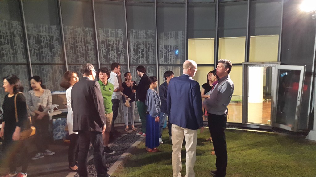 Premierenfeier im Dachgarten des Myeongdong-Theaters. Alexis Bug im Gespräch mit GI-Leiter Stefan Dreyer.