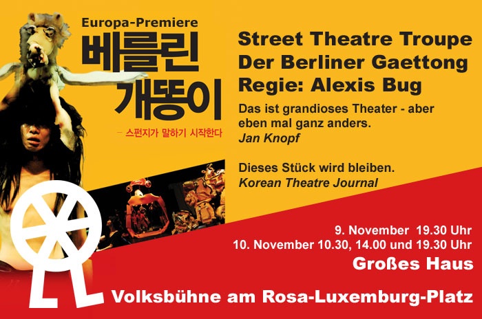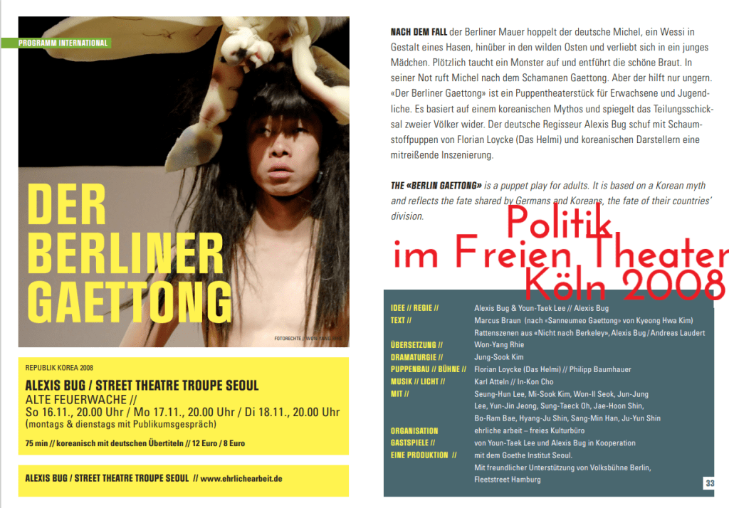 Flyer zur Deutschlandpremiere des deutsch-koreanischen Wiedervereinigungsstück „Der Berliner Gaettong“ von Marcus Braun (Übersetzung ins Koreanische: Rhie Won Yang).