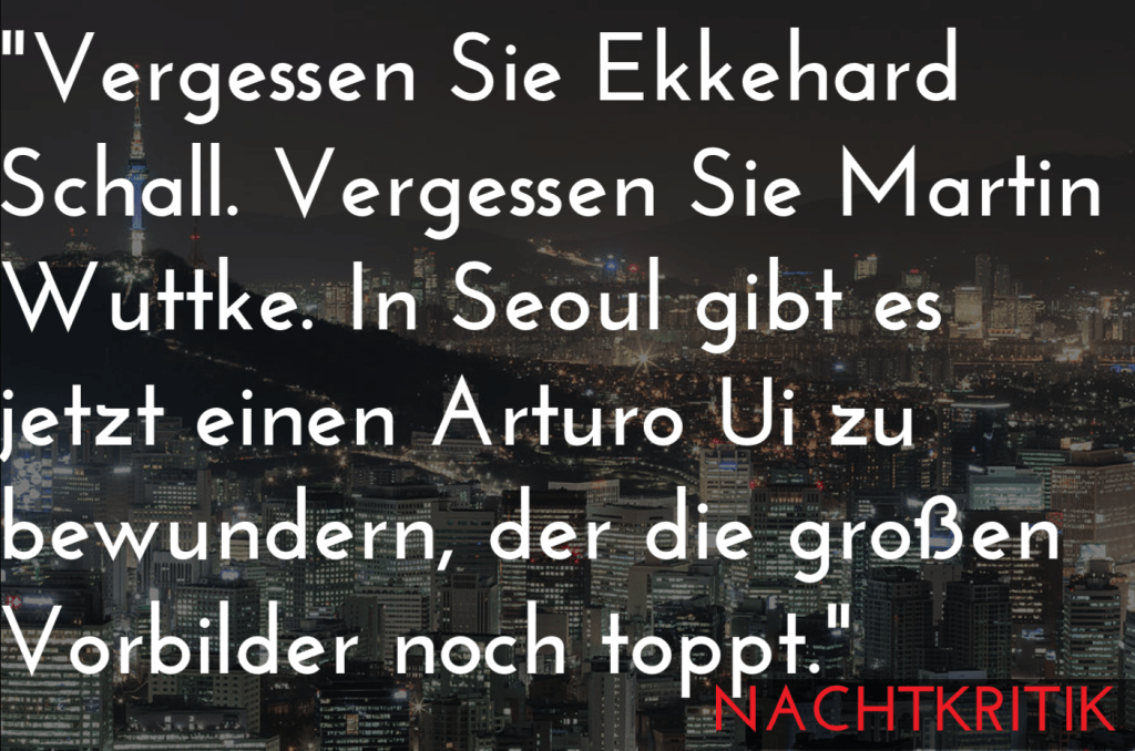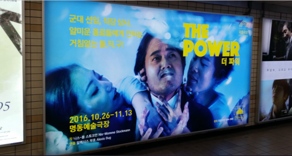 *Myeongdong Theater, erste Bühne der großartigen Theaterstadt Seoul. Bugs Inszenierung „The Power“ von Nis-Momme Stockmann ist die erste Auseinandersetzung eines Koreanischen Ensembles mit postdramatischem Theater überhaupt.