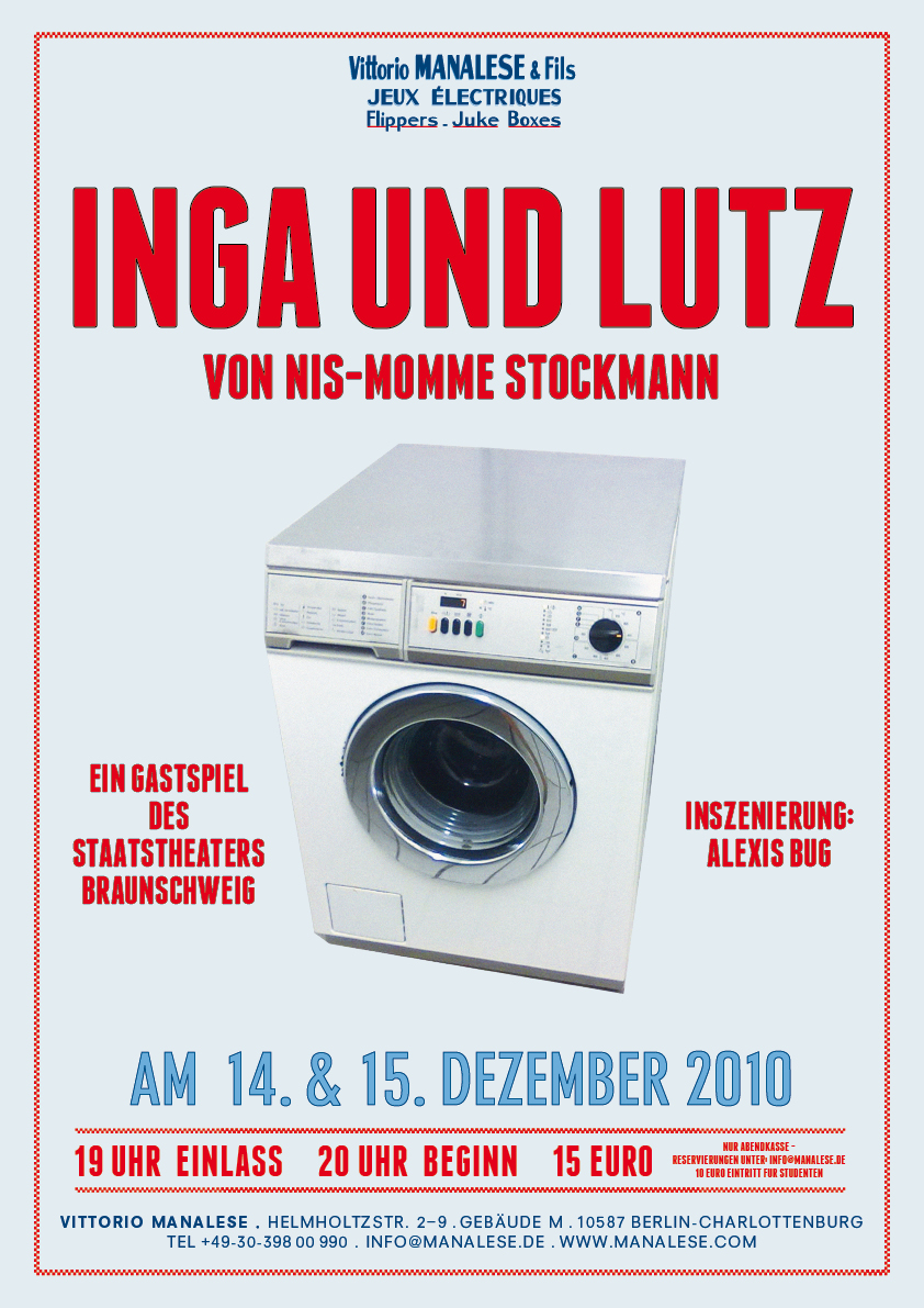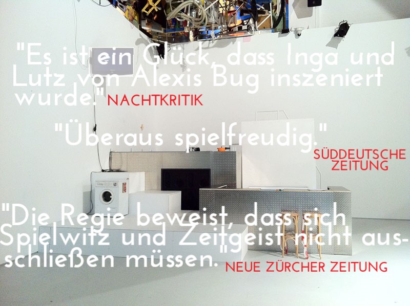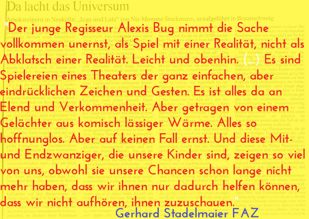 Uraufführung von Nis-Momme Stockmanns Erstlingswerk „Inga und Lutz“ in Braunschweig; Gastspiel in Bruno Brunnets Berliner Galerie Vittorio Manalese.